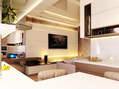 Если в вашей кухне гостиной есть обеденный стол, то подвесной телевизор над ним может стать отличным решением. Вы сможете наслаждаться просмотром любимых программ и одновременно ужинать или завтракать. Подвесной телевизор повысит комфортность пребывания в кухне гостиной и сделает ее еще более функциональной.